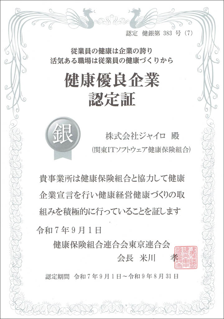 株式会社ジャイロは、健康保険組合連合会東京連合会に「健康企業宣言」を行い、 次の通り積極的な健康経営への取り組みを実施、 2025年9月1日付で「健康優良企業(銀の認定証)」を取得いたしました。(健銀第383号(7))